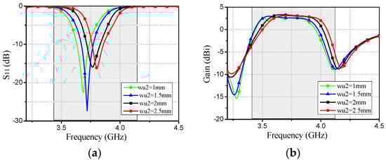 S11 and gain of the filtering antenna versus parameter wu2. (a) S11 versus wu2. (b) Gain versus wu2.