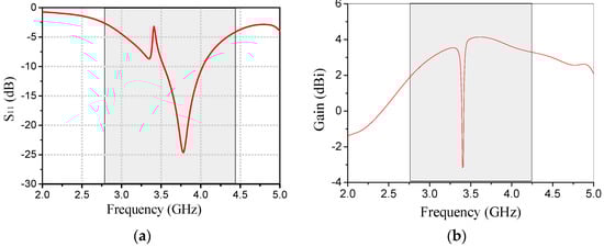 S-parameter and gain of the antenna (when the filter is removed). (a) S11. (b) Gain.