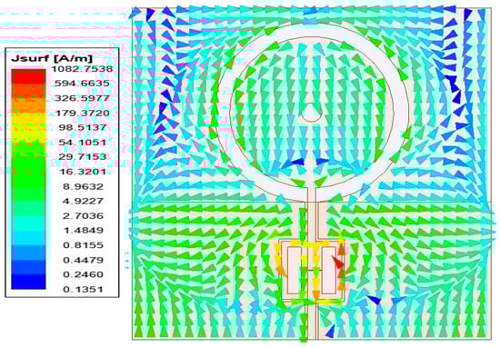 A simulated filtering antenna surface current profile is provided in Figure 8. The current is predominantly distributed around the CPW resonator with electric and magnetic couplings and the circular patch radiator, and the currents run through the circular-patch radiator without altering the orientation. This shows that the filtering antenna can generate a nearly omnidirectional pattern in the plane that is parallel to the magnetic field. Antenna radiation is closely connected to the antenna surface current.