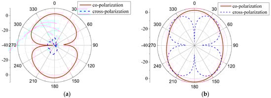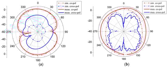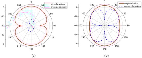 The simulated co-/cross-polarization patterns of the CPW filtering antenna and the antenna without the filtering part are shown in Figure 9 and Figure 10. The E-plane and the H-plane of the co-/cross-polarization patterns of the CPW filtering antenna are shown in Figure 9a and b, respectively, while the E/H planes of the CPW antenna without the filtering part are shown in Figure 10a and b, respectively. The antennas with and without filtering parts have similar radiation patterns and it can be concluded that our proposed filter with SEMC has almost no influence on antenna patterns, although it helps to improve out-of-band suppression and gain discontinuity.