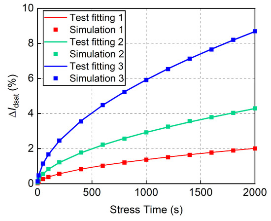 By solving for Equation (20), coefficients = 0.8945, = −1.0892 were obtained and entered into Equation (16) for simulation; the obtained result is illustrated in Figure 6. The error of the coefficients extracted through this method was controlled within 0.0961% when simulating the degradation of the MOSFET transistor. This could also meet practical needs, and the program of this approach is straightforward.