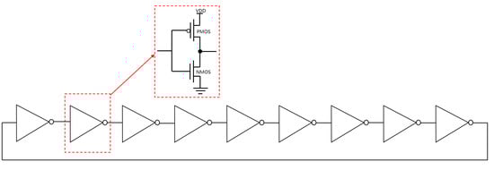 According to the simulation parameters based on multiple systems of equations, we simulated the aging effect (including HCI and NBTI) of the ring oscillator, and its schematic is shown in Figure 7. We simulated the circuit working in a 125-degree environment for 5 years, and its stress voltage was the normal operating voltage, namely, 1.8 V. Under the influence of the aging effect, the oscillation frequency dropped from 72.84 to 72.69 MHz; the simulation result is illustrated in Figure 8. This was mainly because of an increase in the of the MOSFET transistors.