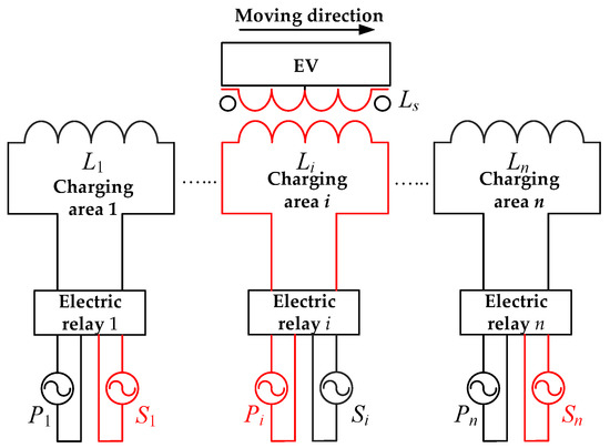 This paper proposes a position detection scheme for electric vehicle dynamic WPT systems in sections based on real-time phase angle perception, which eliminates the need for complex schemes such as communication and external infrared sensors. By solely detecting the internal circuit parameters, the position of secondary side vehicles can be identified in real time. The overall structure of the system is shown in Figure 1. The system includes n dynamic charging areas. Each charging area contains a wireless charging transmitting coil with a self-inductance Li. Each transmitting coil is connected to a high-power AC power supply Pi and a low-power AC power supply Si. Both AC sources have the function of sensing and measuring the impedance phase angle () of the resonator port, which can be used to detect whether the electric vehicle enters or leaves the charging area. The electric vehicle is equipped with a receiving coil with a self-inductance, Ls. When there is no electric vehicle in the charging area, the transmitting coil is only connected to the low-power AC source, and the high-power AC source is turned off to save electrical energy; when a vehicle entering the charging area is detected, the low-power AC source is turned off and the high-power AC source is turned on to charge the electric vehicle dynamically and wirelessly.