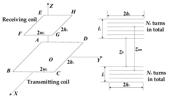 As can be seen from Figure 4, the side lengths of the transmitting coil are 2w1 and 2h1, respectively, with N1 turns in total, and the side lengths of the receiving coil are 2w2 and 2h2, respectively, with N2 turns in total. Then, the mutual inductance of the transmitting coil and receiving coil can be expressed as [16,17]: