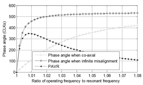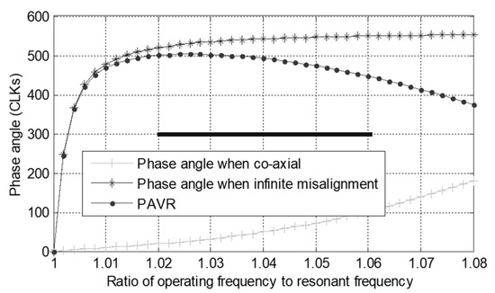 Due to the tolerance and parameter drift of the components, the resonant frequencies of the transmitter and receiver may shift to some extent. Therefore, we change the operating frequency to discuss the robustness of the system. The robustness of the system is also affected by the ratio of the selected operating frequency to the resonant frequency. In fact, the appropriate ratio for the selected operating frequency to the resonant frequency should be a compromise between robustness and . That is, when is large enough, the operating frequency has a large bandwidth. In Figure 8, although the maximum value of appears when the ratio of the operating frequency to the resonant frequency is 1.02, the operating frequency is too close to the resonant frequency. When the actual resonant frequency is slightly larger due to the parameter drift of the components, will decline significantly. If the ratio of the selected operating frequency to the resonant frequency is large, will be smaller, which cannot meet the requirements of the coil switching logic. When considering that the operating frequency is far away from the resonant frequency and needs to have a medium value, a ratio of 1.04 between the operating frequency and the resonant frequency is a good choice. In addition, when the ratio of the operating frequency to the resonant frequency changes from 1.02 to 1.06, the phase angle difference of the coaxial state and infinite distance can exceed 300°, meeting the requirements of the coil switching logic. Therefore, when the ratio of the operating frequency and the resonant frequency of the system can be selected as 1.04, a large operating frequency bandwidth can be guaranteed while meeting the demand, that is, better robustness can be obtained.