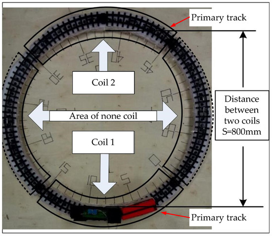 According to the SAE international standard for electric vehicle wireless charging, the resonant frequency of the coil at the transmitting and receiving side of the system design is 85 kHz. According to the above simulation parameters and considering that the electric vehicle track is circular, the electric vehicle track is made as shown in Figure 9, where the coil spacing S is 800 mm, while the length and width of the coil are 630 mm and 100 mm, respectively. The ratio of the operating frequency to the resonant frequency of the system is selected as 1.04, that is, the operating frequency is 88.4 kHz. The main parameters for an electric vehicle rail wireless power supply design and manufacture are shown in Table 2, and 300° is selected as the switching threshold of the system power supply area during operation. The relevant parameters are measured using an E4980ALCR analyzer manufactured in Germany.