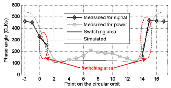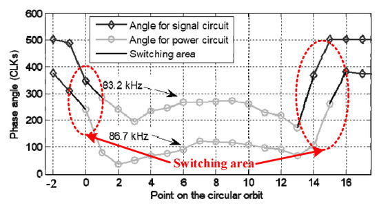 As can be seen from Figure 9, the whole track is divided into 60 equal parts and marked with corresponding figures to measure the phase angle when the electric vehicle is running, wherein, the transmitting coils are uniformly distributed from 0 to 15 and from 30 to 45, and no coils are distributed in other areas. When the electric vehicle runs to the area without coils, it is powered by supercapacitor C, whose value is shown in Table 2. When the vehicle moves on the transmitter coil 1 or 2, the supercapacitor C is charged. The distance between the two coils is about S = 800 mm, and the center distance between the two coils is about S = 876 mm.