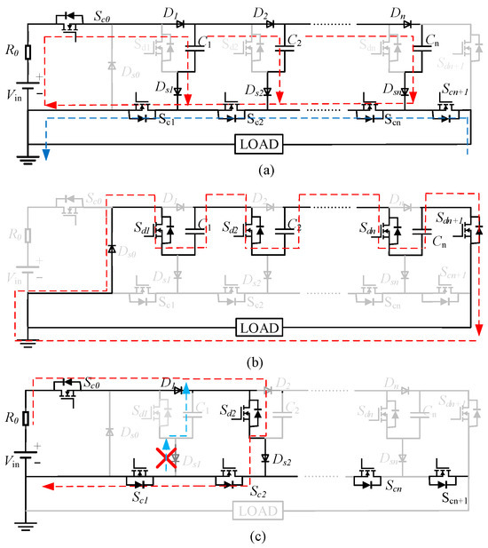 Figure 2 shows the schematic diagram of the n-stage positive diode protection SSMG proposed in this paper, which consists of a DC power supply Vin, a resistor, many power units with diodes, and a load. Figure 2 contains the three phases of the SSMG operation: first is the charging phase (Figure 2a), then the discharging phase (Figure 2b), and finally the overcurrent protection during the discharging phase (Figure 2c). Among them, the DC power supply Vin is an LLC resonant power supply, which can provide continuously adjustable DC voltage. In addition, the maximum output current of the DC power supply can be precisely controlled. Therefore, the short-circuit of the DC power supply is not considered. A current limiting resistor, R0, can also be connected in series with the power supply if necessary. The driver adopts a multi-channel driver based on magnetic isolation technology, so the signals of the charge and discharge switches can be provided simultaneously. The power circuit consists of multiple stages of power cells, each of which includes an energy storage capacitor Cn, a discharge switch Sdn, a charging switch Scn, a charging diode Dn, and a protection diode Dsn. During the charging phase, all charge switches are turned on as indicated by the red arrows in Figure 2a, the discharge switches are off, and the charging diodes and the protection diodes are on, the capacitors are connected in parallel, and they are charged to the same voltage value as Vin.