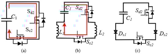 Through current loop in three basic power cells using half-bridge SSMG (a), inductor protection SSMG (b) and diode protection SSMG (c) when charging and discharge switches are on simultaneously.