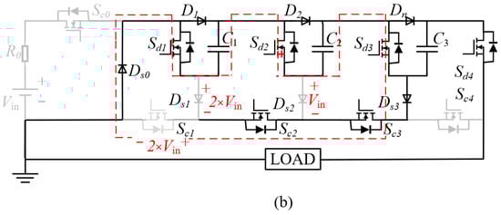 The discharge phase is shown in Figure 2b. During discharging, all discharge switches are turned on, all the diodes but Ds0 are reversely biased and off, and the capacitors discharge in series to generate a high-voltage pulse to the load. At the end of discharge, as shown by the blue arrow in Figure 2a, the discharge switches are turned off. Afterwards, the charge switches are turned on to refresh the capacitors and release the residual charge in the load.