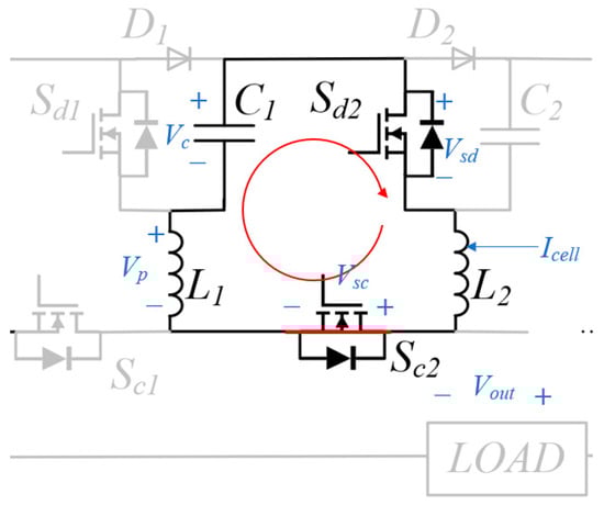 Suppose that the charging switch Sc2 is turned on due to EMI interference in the discharging phase, through current may occur immediately since the discharging switch Sd2 is also in the on-state. In the half-bridge SSMG shown in Figure 3a, the through current can rise to a very high value quickly since the impedance in this loop is low. This short-circuit current may breakdown the switches. In contrast with the inductor isolation circuit shown in Figure 3b, the inductors limit the rising rate of the through current, but it is only effective when this fault last for a very short time. If the through current lasts for longer than 5 μs, the current would still exceed the allowed maximum current and result in the breakdown of switches. Moreover, the charging current flowing through these inductors may boost the voltage over capacitors in repetitive operation, which may cause overvoltage breakdown of components [26,27,28].