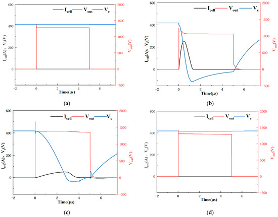 Based on the aforementioned modeling method, we conducted calculations for the model and obtained the corresponding results. Figure 6 shows the waveforms of Icell, Vout, and Vc in the normal operation and in the fault stage in the simulations of three circuits when Sc2 is falsely turned on. With a 3-pF light capacitive load, the small current only occurs during the rising and falling periods of pulses, as in Figure 6a. As shown in Figure 6b, the short-circuit current in the half-bridge SSMG rises to 250 A quickly. This instant high current was much higher than the allowed 80-A pulsed drain current of the switch and could easily cause the breakdown of it. Figure 6c shows the waveforms of the inductor protection SSMG. The short-circuit current was clamped to under 60 A by inductors, which indicates that these inductors can limit the overcurrent. In addition, it can be seen that the output voltage amplitude exceeded 1260 V, indicating that these inductors have already boosted the charging voltage over capacitors. The waveforms of the diode protection SSMG are shown in Figure 6d. As can be seen, there was no obvious overcurrent generated since the overcurrent loop was blocked by Ds1. Unlike in the other two cases, there was no sudden drop of the voltage across capacitor C2, which further proves that there is no overcurrent in this condition. The waveform of the output voltage is the same as in normal operation conditions (Figure 6a,d). Therefore, the diodes inserted into SSMGs showed the best overcurrent protection effect among the three circuits in Figure 3.