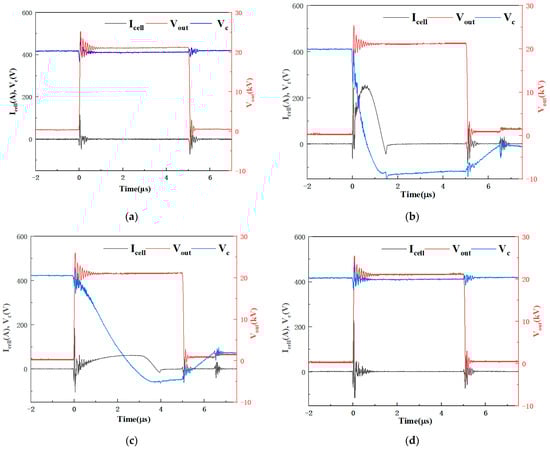 A control group experiment with no fault was also carried out for comparison. Figure 8a shows the output voltage and current waveforms in normal operation conditions. It shows that the pulsed voltage amplitude was 22 kV, while the intra-stage current Icell had a high-frequency oscillation of about 100 A amplitude during turn-on and turn-off processes, respectively. This waveform also contains the EMI component due to the high dV/dt corresponding to the pulse edges. Similar high-frequency oscillation with higher amplitudes also appears in all other experiments as in Figure 8.