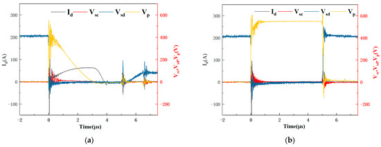 The drain-source voltage Vsd of the discharge switch and the voltage Vp across the protection inductors or diodes were also measured and presented in Figure 9. As in the short-circuit stage in the half-bridge SSMG, the voltage instantly fell on the inductor L1 and decreased gradually to zero with the increase in the through current, as shown in Figure 9a. In the fault stage in the diode protection SSMG as shown in Figure 9b, the voltage fell on the diode Ds1 throughout the discharging process. So, there was no continuous through current. This further proves the successful blocking of through current by these diodes.