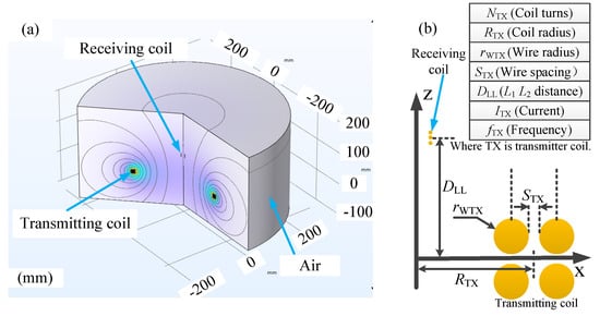 For the wireless power transfer scenario in capsule endoscopy applications, we configured the receiving coil with a diameter of 13.0 mm, a wire diameter of 0.19 mm, and 200 turns. The diameter, wire diameter, and turns of the receiving coil were determined according to recent references [9,46], ensuring the selected parameters are acceptable for the human body. These parameters can determine the value of and . Therefore, they can affect the transmission efficiency of the system, but due to the size of the capsule, only parameters closer to the actual use can be chosen. After performing a COMSOL simulation using the selected parameters, we obtained the results for the receiving coil on the capsule endoscopy, which showed that the inductance is 229.45 H, and the quality factor is 15.69. The outer diameter, wire diameter, wire spacing, and number of turns of the transmitting coil are all variable in order to solve the optimal transmitting coil parameters. A sectional view of the 3D model in COMSOL can be seen in Figure 3.