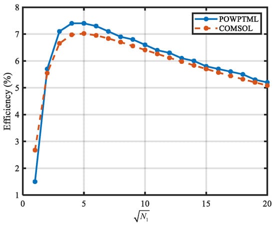 The trained model can be used for parameter optimization. For example, the wire diameter, the distance between adjacent wires, and the outer diameter of the transmitting coil are 1.9 mm, 0.1 mm, and 300 mm, respectively. When these parameters are determined, we can use our trained model and COMSOL to find the optimal number of turns () to reach the highest efficiency. The relationship between efficiency and the number of turns () is calculated via COMSOL and POWPTML, as shown in Figure 4.
