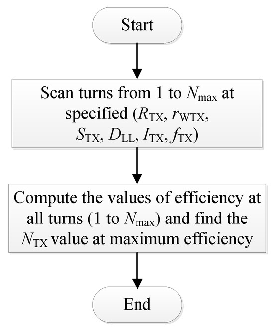 To illustrate how to automatically find the optimal parameters, we will present an example using the optimization of the number of turns. The process for finding optimal values for other parameters is similar to this example. First, we use the trained ML model to compute all the circuit parameters of the transmitting coil turns from 1 to using Python code, where is the specified maximum number of turns. Then, the efficiency values for each number of turns from 1 to are computed. The program outputs the number of turns with the maximum efficiency and generates a plot of the relationship between efficiency and the number of turns. A flowchart for this process is shown in Figure 5.