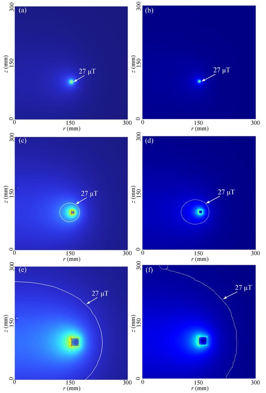 Obtaining accurate magnetic field distribution is crucial for ensuring the safety of equipment or the human body in wireless power transfer (WPT) systems. Prior to fabricating the WPT system, we can use COMSOL or POWPTML to calculate the magnetic field distribution. The magnetic field distribution calculated via COMSOL is shown in Figure 6a,c,e, and that calculated via POWPTML is shown in Figure 6b,d,f. The POWPTML method was able to draw the curve of a safe magnetic flux density of 27 T, indicating its effectiveness in ensuring the safe operation of the WPT system.