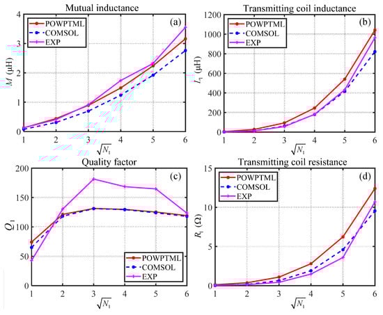 In the experiment, the parameters of the receiving coil were measured first. The inductance of the receiving coil was 231.06 H, the quality factor was 36.94, and the resistance was 8.57 . We also measured the parameters of the transmitting coil with turns 1, 4, 9, 16, 25, and 36. Then, the mutual inductance between the transmitting coil and the receiving coil was measured at a center distance of 60 mm. A comparison of these parameters is shown in Figure 9. The errors for POWPTML and experiments using COMSOL, as reference values, are shown in Table 3.
