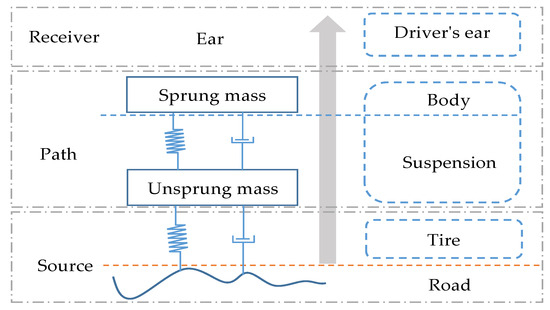 SRN is generally stimulated by roads, tires through the front and rear suspension system connecting rods, and elastic components transferred to the body, causing the body wall plate vibration and radiation noise to the interior of the vehicle and ultimately transferred to the human ear. Figure 1 depicts the SRN transmission process from the perspective of the “source-path-receiver”.