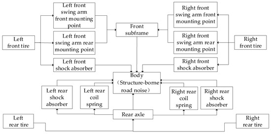 Road noise, contingent upon its transmission path, delineates into air-borne noise and structural-borne noise [5]. Air-borne noise predominantly spans the middle- to high-frequency spectrum, ranging from 300 Hz to 8000 Hz, emanating primarily from the tires and the noise generated by road friction. Addressing air-borne noise involves strategic interventions such as acoustic packaging and the optimal design of tires [6]. In contrast, structural-borne noise predominates in the frequency band from 20 Hz to 300 Hz, manifesting as noise transmitted through structural pathways. Frequently characterized by driver and passenger complaints of “low-frequency drumming” and “mid-frequency rumbling”, Structural-borne Road Noise (SRN) assumes particular significance [7,8]. The transmission path of structural-borne noise is intricate and challenging to control, but it is very easy to cause discomfort to drivers and passengers, which is the focus of this paper.