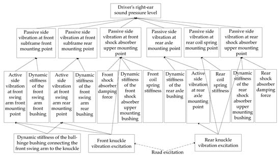According to the SRN transmission relationship, the road noise along the vibration transmission path is decomposed layer by layer to the chassis component parameters. Accordingly, the SRN multi-level decomposition architecture is established, as shown in Figure 3. Among them, the top-level design target is the driver’s right-ear Sound Pressure Level (SPL); the adjacent lower-level design variables are the passive side vibration response of the suspension and body attachment points (including front subframe front mounting point, front subframe rear mounting point, front shock absorber upper mounting point, rear axle mounting point, rear coil spring mounting point, and rear shock absorber upper mounting point); further downward decomposition of the adjacent lower-level design variables are the active side vibration response at the suspension-body attachment points (including front swing arm front mounting point, front swing arm rear mounting point, and rear axle mounting point) and the dynamic parameters of the suspension components (including dynamic stiffness of the front swing arm front and rear bushings, dynamic stiffness of the front and rear shock absorber upper mounting bushings, front and rear shock absorber damping force, front and rear coil spring stiffness, dynamic stiffness of the rear axle bushing); and the bottom level is the vibration excitation from knuckle, and the ball-hinge bushing dynamic parameters. The decomposition principle of the road noise multi-level decomposition architecture is that the design goals of the upper level are decomposed downward into the excitation of the nearby lower level and the dynamic parameters of the connecting elements.