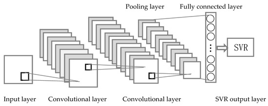 The CNN–SVR hybrid model includes an input layer, two convolutional layers, a pooling layer, a fully connected layer, and an SVR output layer. The input layer is used to accept data input and perform data preprocessing. The convolutional layer is mostly utilized for automatic data feature extraction through the convolutional kernel. The expression of the convolution operation is shown in Equation (1) [34]: