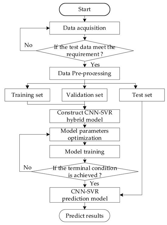 Figure 5 displays a flowchart for SRN prediction based on CNN–SVR. The prediction process includes two parts: data acquisition and processing and CNN–SVR model training and validation. The detailed steps include the following: (1) Based on the road noise transmission path analysis and multi-level decomposition architecture, pre-screen the factors that have a large impact on road noise. The sample data required for constructing the road noise prediction model are collected through road experiments, and the data are preprocessed. (2) Construct the CNN–SVR hybrid model, optimize the model parameters, and train and evaluate the model based on the sample data of the training data and validation data. The process is complete if the model converges and satisfies the termination conditions (maximum epoch, predetermined accuracy requirements, etc.). If not, more sample data must be added or the model parameters adjusted until the requirements are met, and the test data is used to further assess the model’s generalization capacity. Finally, the ideal parameter model for road noise is obtained.