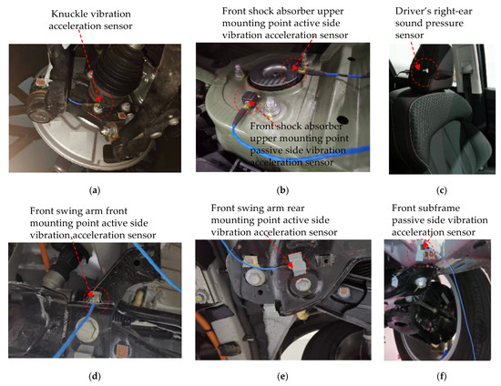Sensor arrangement: (a) Knuckle vibration acceleration sensor; (b) Front shock absorber upper mounting point active side and passive side vibration acceleration sensor; (c) Driver’s right-ear sound pressure sensor; (d) Front swing arm front mounting point active side vibration acceleration sensor; (e) Front swing arm rear mounting point active side vibration acceleration sensor; (f) Front subframe passive side vibration acceleration sensor.