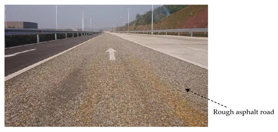 It is important to choose a suitable working condition for the test. When the vehicle speed of electric vehicles is lower than 40 km/h, the motor and fan noise play a major role. When the vehicle speed is more than 80 km/h, the wind noise gradually becomes the dominant noise. When the vehicle is traveling at a medium speed of 40~80 km/h (especially on the rough road), vehicle suspension structure-borne noise makes up the majority of the interior noise. In order to better imitate the suspension structure-borne noise of the test vehicle, this paper chooses the constant speed of 60 km/h, and the rough asphalt pavement is used as the test road [37,38]. The reasons for choosing the rough asphalt road for road noise test mainly include the following two points: first, the rough road can fully stimulate the vehicle structure-borne noise and minimize the contribution of other noises; and second, the rough asphalt road is a typical road for passenger cars driving in urban roads, and the test results on this road can better reflect the road noise level of the vehicle under the actual driving road. The rough asphalt road used for the test is shown in Figure 7. During the test, external noise interference should be minimized by closing the windows, air conditioning, etc., and ensuring that no abnormal noise is generated. In addition to the driver, the necessary test personnel and test equipment should be used as far as possible to keep the vehicle in an unloaded state.