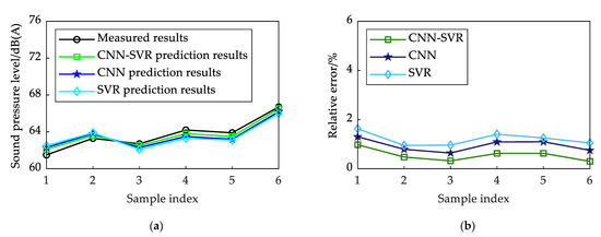 To verify the effectiveness and generalizability of the CNN–SVR hybrid model more thoroughly, the test set of 6 groups of sound samples is analyzed. The model prediction results and the actual vehicle measurement outcomes, along with their respective errors, are compared in Figure 9. From Figure 9, it is noticeably observed that the CNN–SVR hybrid model has better accuracy in predicting as its maximum relative error is less than 2%, which is also lower than the other two models. Consequently, the CNN–SVR hybrid model is more favorable for future optimization and control of structural-borne vehicle noise.