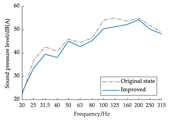As shown in Table 4 and Figure 10, the SPL at the driver’s right ear is 61.3 dB(A) after the improvement, which is 2.6 dB(A) lower than that before the improvement, with an improvement of 4.07%. The relative errors of model prediction results and measured results before and after the improvement are 1.10% and 0.82%, respectively, which are both less than 2%, verifying the accuracy and effectiveness of the proposed method.