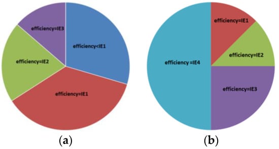 Division of unit production motors with shaft heights of 315 mm or more depending on their efficiency classes for LV (a) and HV (b) motors.