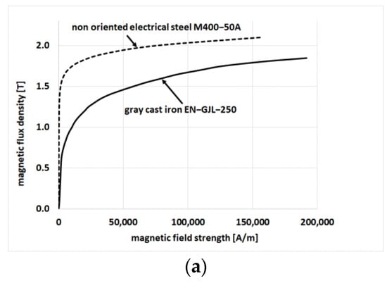 The cores of the motors are made of M400-50A [30] electrical sheet metal with a thickness of 0.5 mm. Both motors have a magnetic housing made of gray cast iron EN-GJL-250 [31,32,33] with a pearlitic matrix with particles of flake graphite and with the following material properties: density of 7.2 g/cm3, resistivity of 0.73 Ω·mm2/m, magnetic permeability of 220~330 μH/m, and hysteresis losses of 2500~3000 J/m3 at magnetic induction B = 1T.