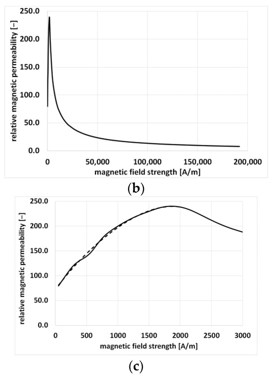 Magnetization characteristics of the gray cast iron and electrical steel M400-50A (a) and relative magnetic permeability of the frame material (gray cast iron) in the entire range of magnetic field strength (b) and for magnetic field strength < 2000 A/m (c) [31,32,33]. In (c), the solid line corresponds to the measurement, and the dashed line to the approximation.