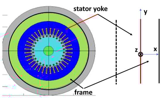 This problem mainly concerns motors which make significant use of a magnetic circuit, which results in high induction values in the motor core, especially in the stator yoke. In addition to the losses in the part of the housing directly adjacent to the stator yoke, additional power losses can also occur in parts of the housing not adjacent to the stator core due to stray fluxes around the stator’s winding end connections. So far, this problem has been considered when analyzing losses in the front parts of the core and structural parts, such as the clamping plate and fingers in high-power turbogenerators and induction motors, as well as in the case of canned induction motors [38,39,40,41,42,43,44,45]. These phenomena will be the subject of further work for the authors.