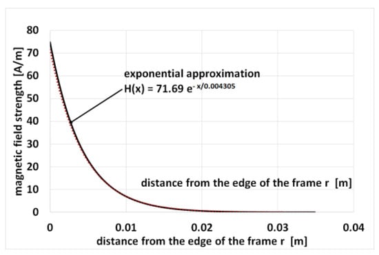 Figure 5 shows the distribution of the magnetic field strength along the frame thickness x obtained from the FEM model and the approximation of this distribution using an exponential function. Obtaining a good-quality waveform requires, of course, adequate discretization using triangular elements. The applied division significantly exceeds the most frequently suggested division into at least three elements at a given penetration depth. The equivalent penetration depth δ was determined from Formula (1)—0.0042999, with an error about the simulation of 0.11%. The determined eddy current losses were as follows: from the 2D model—0.0396 W, and from the formula for an amplitude H on the surface equal to 74.95141 A/m—0.0375 W; the difference was 5.42%. The hysteresis losses were as follows: from the 2D model—0.009688 W, and from the formula for an amplitude B on the surface 0.0192 T—0.00937 W; the difference was 3.3%. The flux penetrating the housing (maximum value) was as follows: from the 2D model—5.76398E-06 Wb, and from the formula—5.85 × 10−6 Wb; the difference was −1.48%. As can be seen, the mapping is very accurate for the linear variant. Differences result from the curvature of the housing and FEM errors (the size of the dividing element in the radial direction is 0.5 mm for a penetration depth of 4.3 mm).