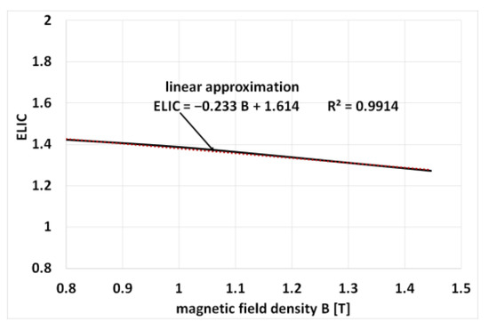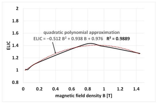 Figure 6, Figure 7 and Figure 8 show the eddy current losses improvement coefficient (ELIC) factor for correcting eddy current losses from linear to non-linear cases. It was determined as a function of the magnetic induction amplitude on the housing surface. Two types of approximation were proposed: quadratic polynomial and linear approximation for selected induction ranges. As you can see, non-linearity causes a significant increase in losses of up to 40% of the losses calculated for the linear variant.