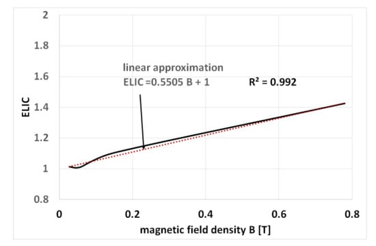 The ELIC correcting factor for eddy current losses with a linear approximation for induction range up to 0.8 T (black—data, red—approximation).