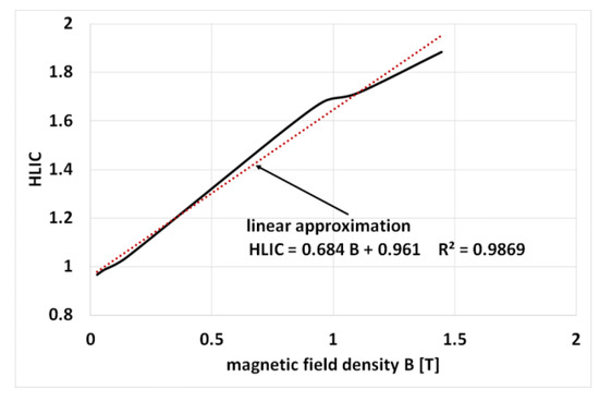Figure 9 and Figure 10 show the hysteresis losses improvement coefficient from linear to non-linear cases (HLIC) factor for correcting hysteresis losses in the frame. It was determined as a function of the magnetic induction amplitude and magnetic field strength on the housing surface. Two types of approximation were proposed: linear for induction and logarithmic for magnetic field strength. Similarly, as with eddy current losses, non-linearity causes a significant increase in hysteresis losses of up to 85% of the losses calculated for the linear variant.