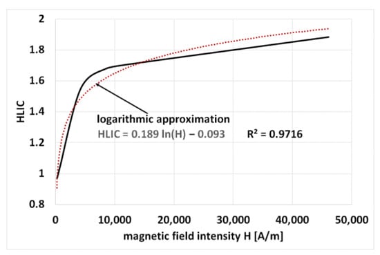 The HLIC correcting factor for hysteresis losses with a logarithmic approximation for magnetic field strength (black—data, red—approximation).