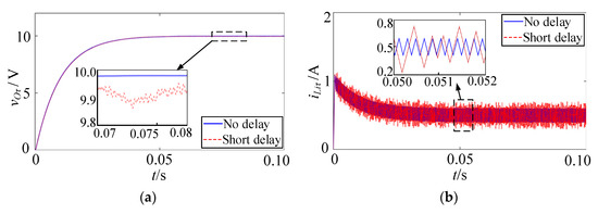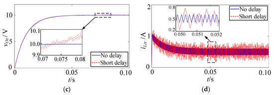 Figure 2b,d display the system inductance current iLiτ under different short delays. According to the data presented in Table 2, the maximum ripple amplitude ΔiLiτ at random time delays within the interval [0, 0.05 ms] and [0, 0.1 ms] amounts to 0.38 A and 0.57 A, respectively, both of which exceed the value of 0.21 A observed in the absence of time delay. This amplitude of ΔiLiτ gradually increases with increasing delay duration. It is important to note that the system continues to operate under CCM in both cases. This observation signifies that the system can maintain a continuous current output even in the presence of short delays, with the output voltage being essentially unaffected.