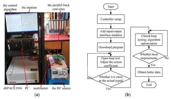 In this paper, the dSPACE1006 controller with powerful data computing capability is selected to verify the designed control strategy and some theories. The experimental platform of the parallel buck converter control system based on dSPACE1006 is established as shown in Figure 7a, and its operating process is illustrated in Figure 7b.