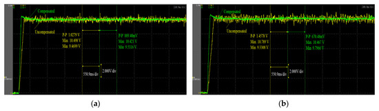 The system output vOτ, before and after compensation, under different intervals of long delay are presented in Figure 6a,c,e. When the delay τ falls in [0, 0.2 ms], it can be seen that the compensated vOτ is 0.2 V lower than the uncompensated voltage fluctuation, and the dynamic response time of the voltage is nearly 0.01 s higher, and the maximum voltage error ΔvOτ_max is reduced from 0.78 V to 0.01 V by compensation. When the delay τ further increases to the range with [0, 0.4 ms], the uncompensated vOτ shows more violent fluctuations, and the steady-state error reached 0.31 V, while the compensated vOτ remained stable, with only 0.08 V steady-state error, and the ΔvOτ_max is also reduced 1.38 V. When the τ falls in the range [0, 0.2 ms], it can be seen from the uncompensated vOτ that the transmission of the control signal of the system is seriously damaged at this time, and the ΔvOτ and ΔvOτ_max reach 0.35 V and 2.41 V, respectively. However, they can be reduced by 0.24 V and 0.99 V through compensation, so that the voltage curve can remain stable, which also evidences that the addition of multi-step predictive control significantly reduces the fluctuation range of the output voltage and current, leading to a more stable system output.