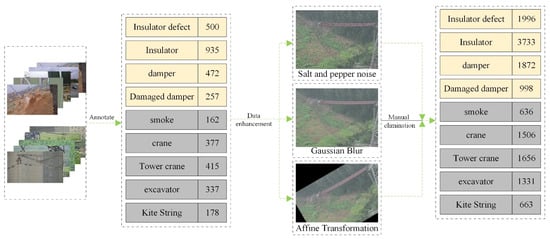 The quality and variety of the to-be-constructed dataset are essential to the detection performance of the DL-based approach. This paper employed a two-step strategy, including data construction and image enhancement, to construct the final large-scale dataset (Figure 2) of foreign objects and component defects. Foreign objects include large-scale excavators, kite lines, tower cranes, wildfire, and other abnormal objects. When collecting images, the inspection robot can move near to the target and keep a close distance, but considering the subsequent detection of long-distance and small objects, we collected images of the same object at different distances. Such a dataset enables the trained model to detect objects at different distances when detecting them. The component images include insulators and dampers with/without defects, most of which come from a public dataset named China Power Line Insulator Dataset (CPLID), including images of both normal and (synthetic) defective insulators [41].
