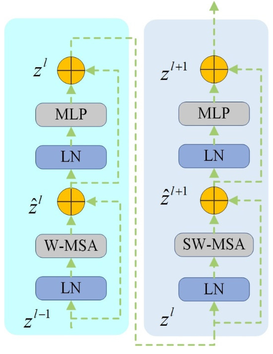 The Swin transformer module [45] adopts a hierarchical windowing mechanism to focus on features at different scales. The windowing mechanism divides the feature map into varying-sized regions (windows) and employs several two-layer structures to process them (Figure 4). In a two-layer structure, each layer is equipped with an MLP module and two LayerNorm (LN) layers that normalize the inputs. The two layers vary in that the former layer employs a window-based multi-head self-attention (W-MSA) function, and the latter layer utilizes a shifted window-based multi-head self-attention (SW-MSA) function. Equations (2) and (3) show the computational procedure for the former layer,