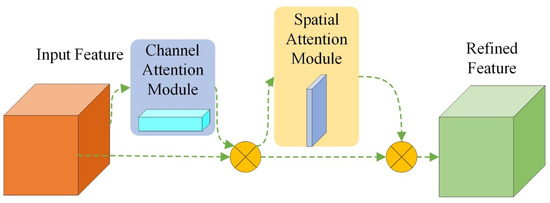 The convolutional block attention module (CBAM) [48] adaptively adjusts the importance of feature maps from different channels and spatial locations and then multiplies the weights by the original feature map to produce the final feature map (Figure 5). It is verified that the consequent calculation can fully account for the correlation between channels and spaces by comprehensively unrevealing the critical information of feature maps.