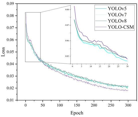 To verify the validity of the above model, we trained YOLO-CSM and compared it to other models, mainly Faster-RCNN, YOLOv5, YOLOv7, and YOLOv8 (You only Look Once version 8). Faster-RCNN is a two-stage detection model different from the YOLO series, YOLOv5 is a more popular and practical model developed in recent years, and YOLOv8 is the latest research version of the YOLO series. We analyzed the loss value of YOLO-CSM during the training process and used the trained model to detect images after the training was completed. In addition, we compared the accuracy, number of parameters, F1_score, and other metrics.