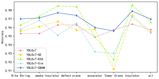 Figure 9 compares the detection accuracies after adding different attention modules to YOLOv7. After integrating SE or Sim with YOLOv7, the detection accuracy was improved for some objects, such as smoke and insulator. However, for objects present at a greater distance, such as the tower crane, both the SE and Sim methods had a greater degree of degradation in accuracy, which may be attributed to the distance and the lack of distinctive feature expression. The average accuracy of the hybrid attention mechanism was higher than that of YOLOv7, but it performed differently when detecting images of objects with different resolutions, i.e., the accuracy was high when detecting high-resolution insulator defects and pylons and low when detecting low-resolution pylons. The contrasting performance can be attributed to the ECA attentional mechanism’s greater emphasis on the relevant channels. CBAM’s accuracy also decreases when recognizing tower cranes, but the decrease is smaller than that of ECA. Therefore, we integrated CBAM’s hybrid attentional mechanism into YOLOv7 to make it focus on both the spatial and channel aspects of the image.