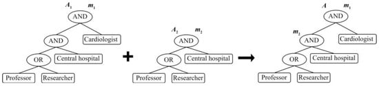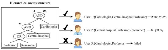 In Hierarchical Access Control, multiple access structures with hierarchical relationships can be integrated into a single access structure. As shown in Figure 2, and represent the access structures of and , where the access structure of contains . Thus, they can be integrated into a single access structure . As shown in Figure 3, the attributes of User 1 satisfy the entire access structure and can decrypt all data. The attributes of User 2 satisfy the partial access structure; only the data associated with this part can be decrypted.